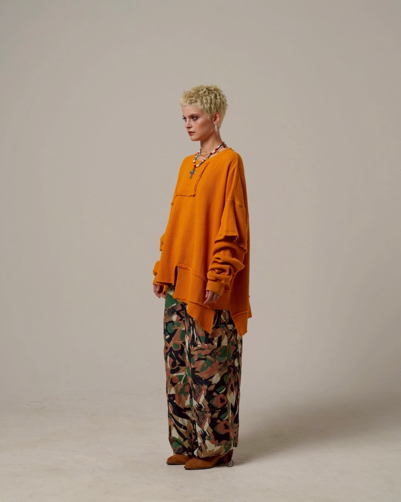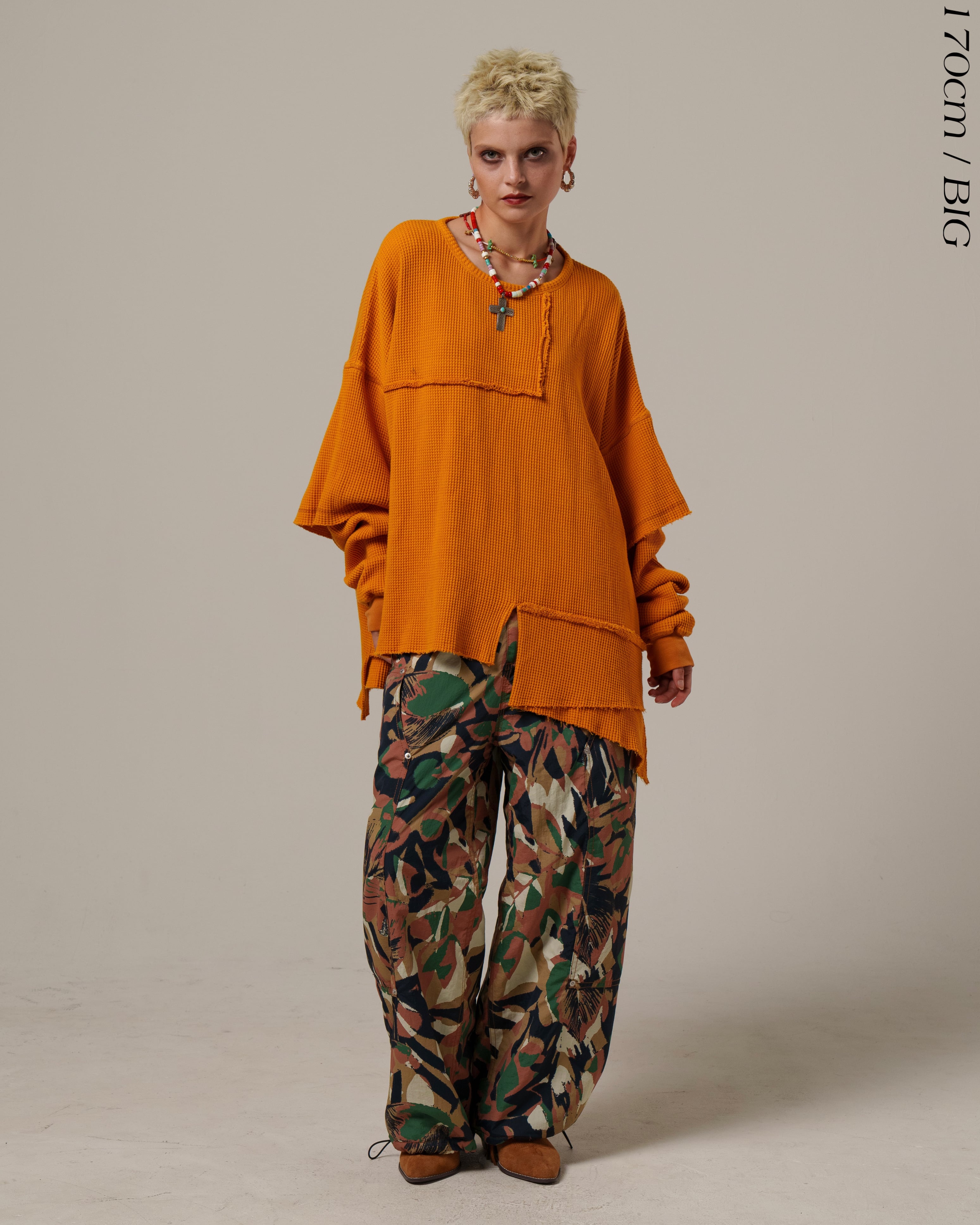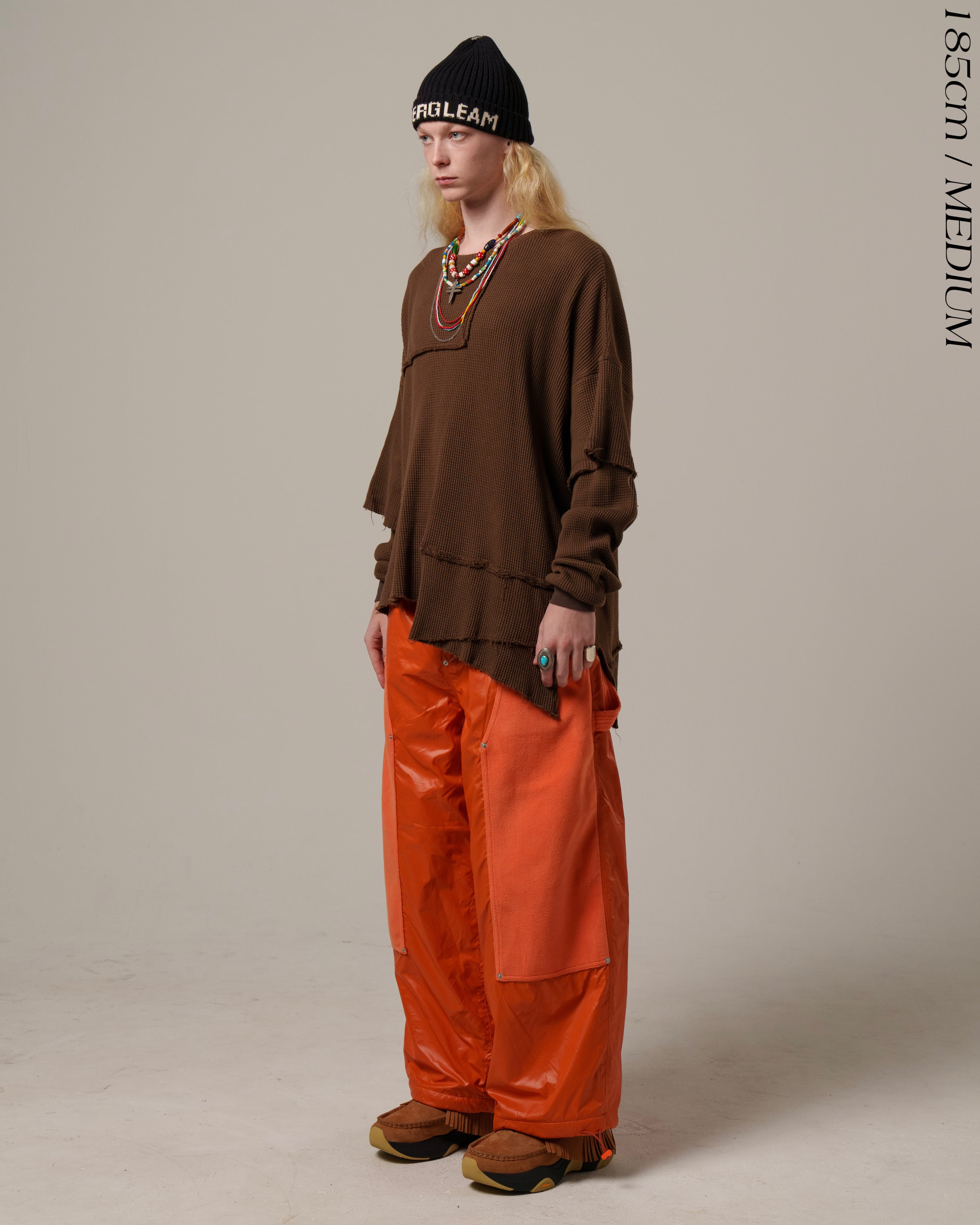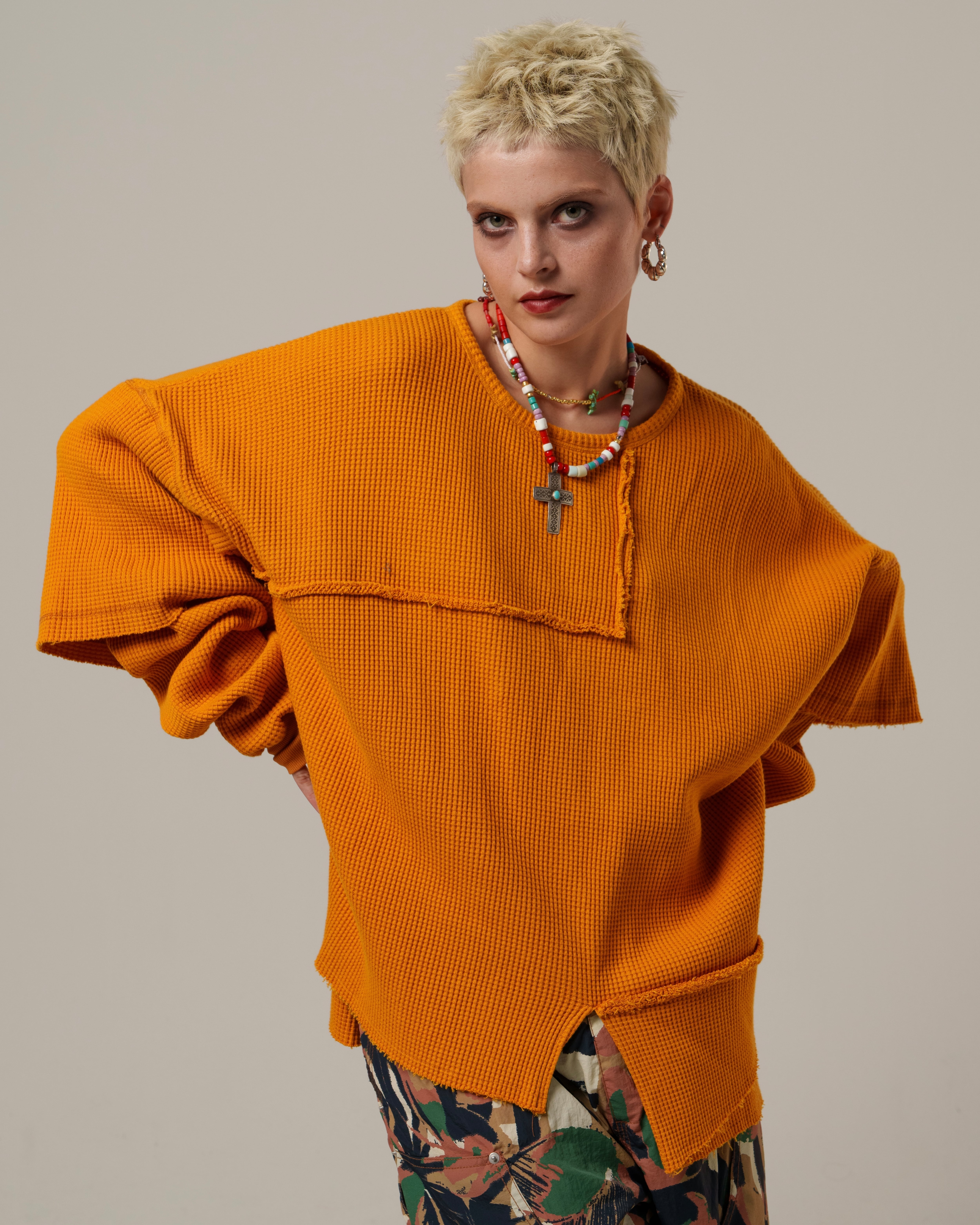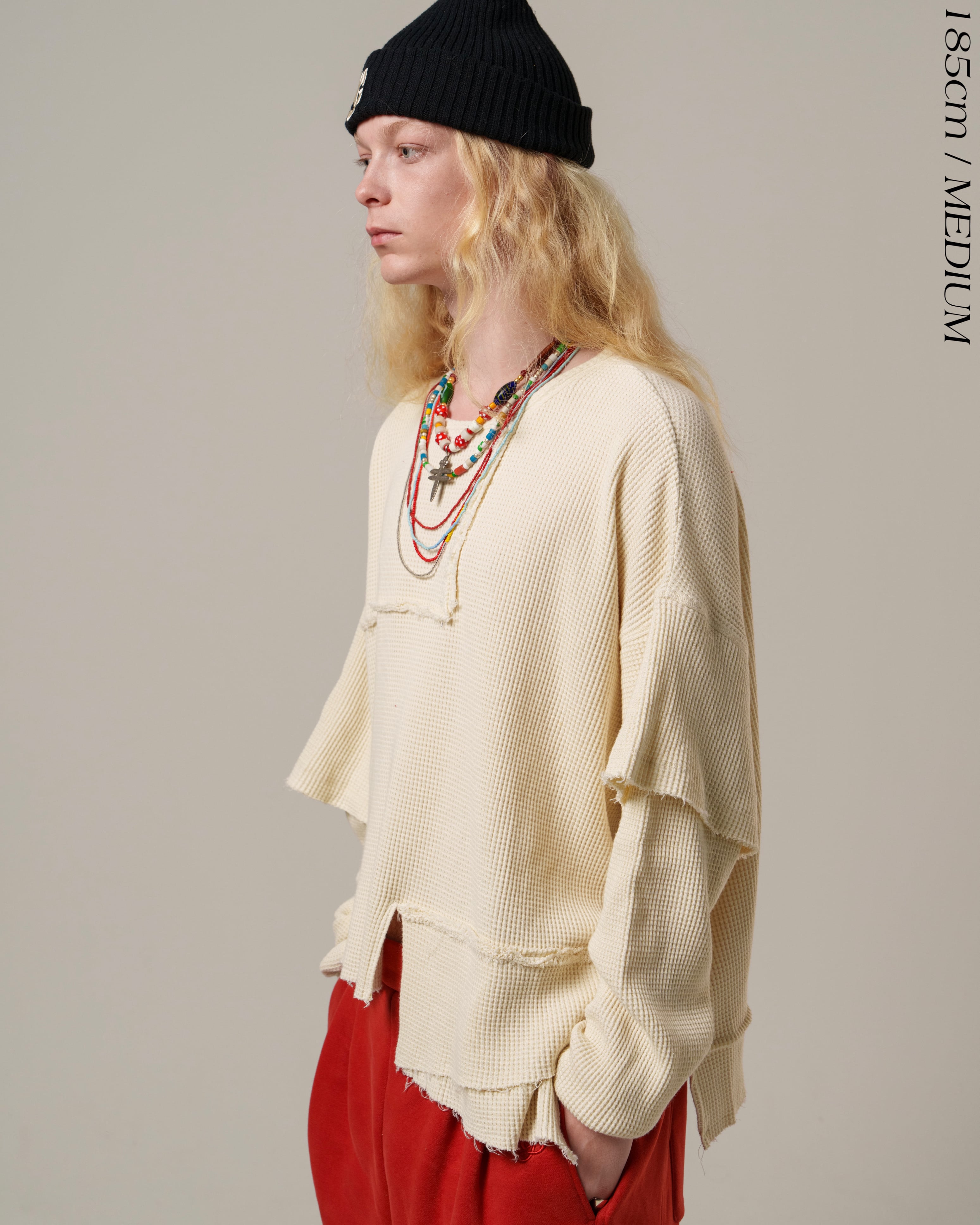 サーマル素材のカジュアルさに厚みとクラフト感を加え、グランジへと昇華させました。