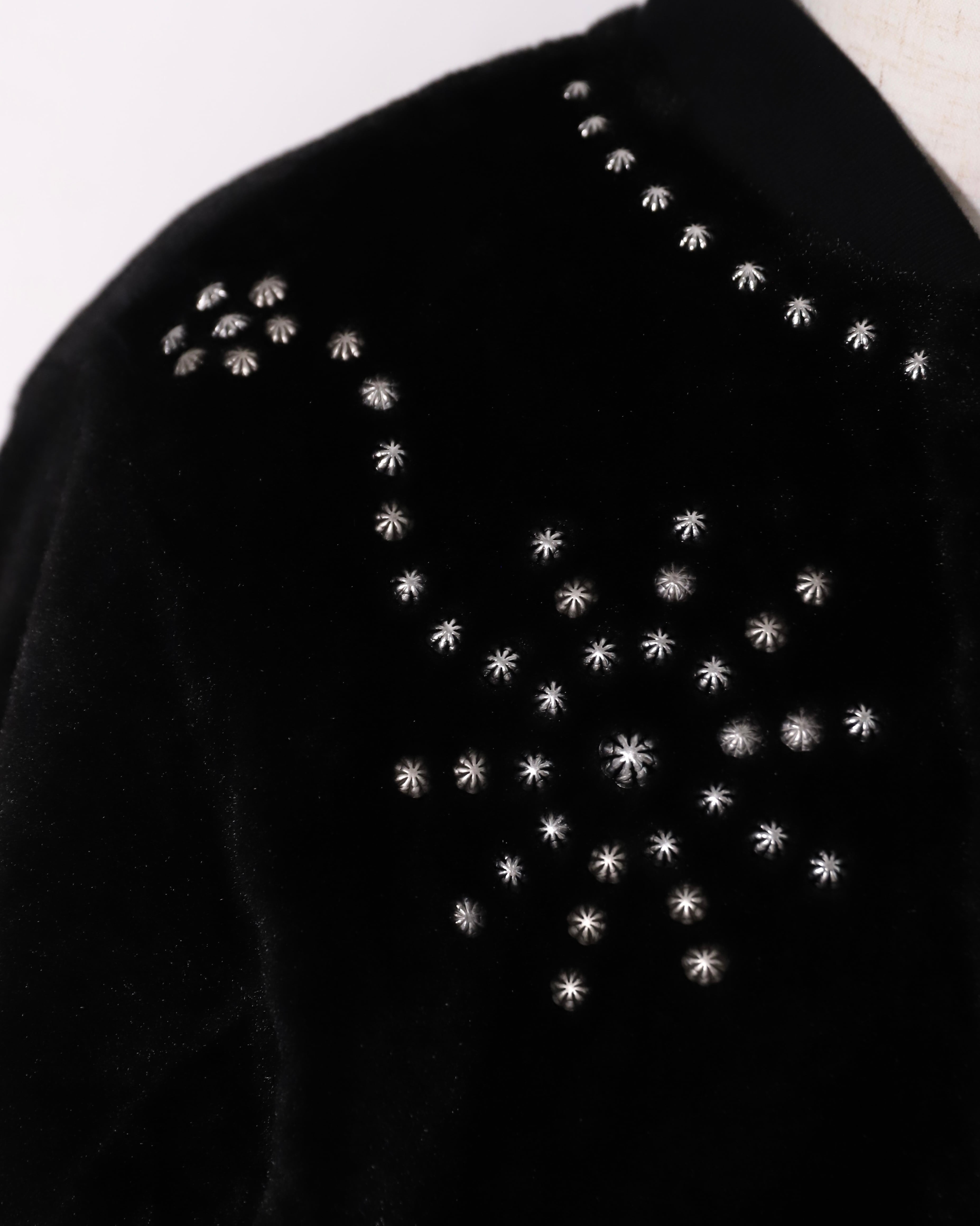 スタッズの輝きが加わり、クラシックでありながらエッジの効いた印象に。