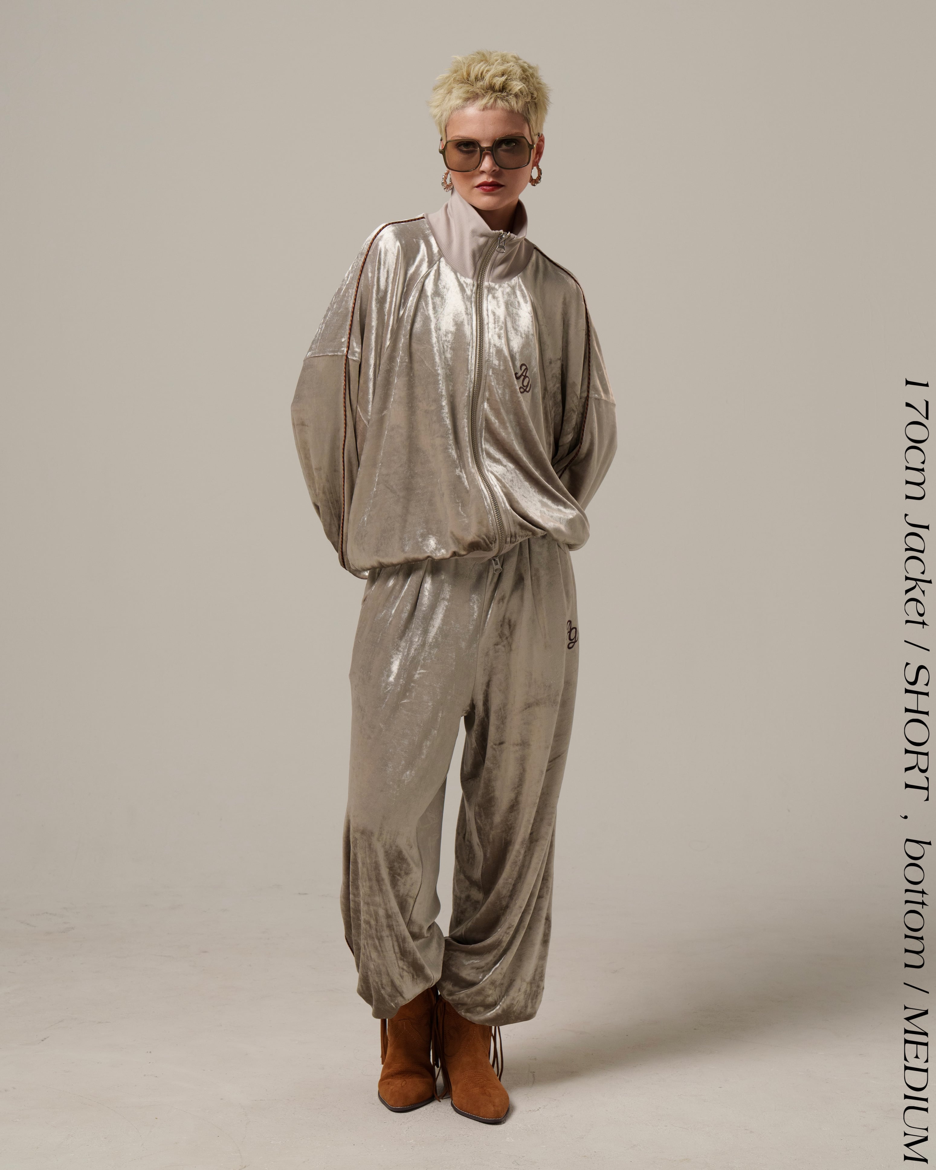 クラッシュベロアギャザーパンツは、クラシカルな素材感をベースに、スポーティーなディテールを融合させた一枚。