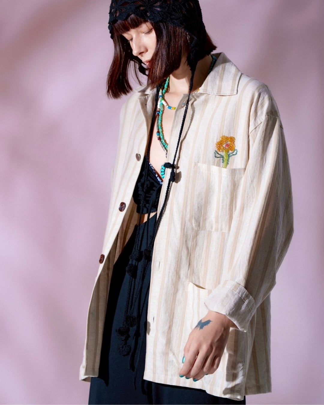・胸ポケットには、AMBERGLEAMのシンボルである花モチーフをビーズ刺繍で表現