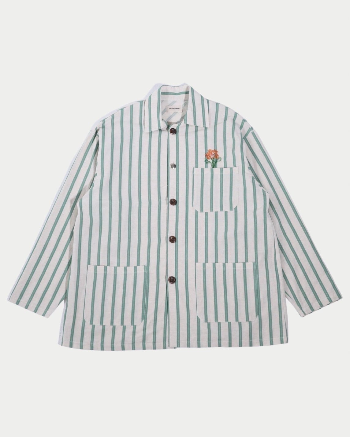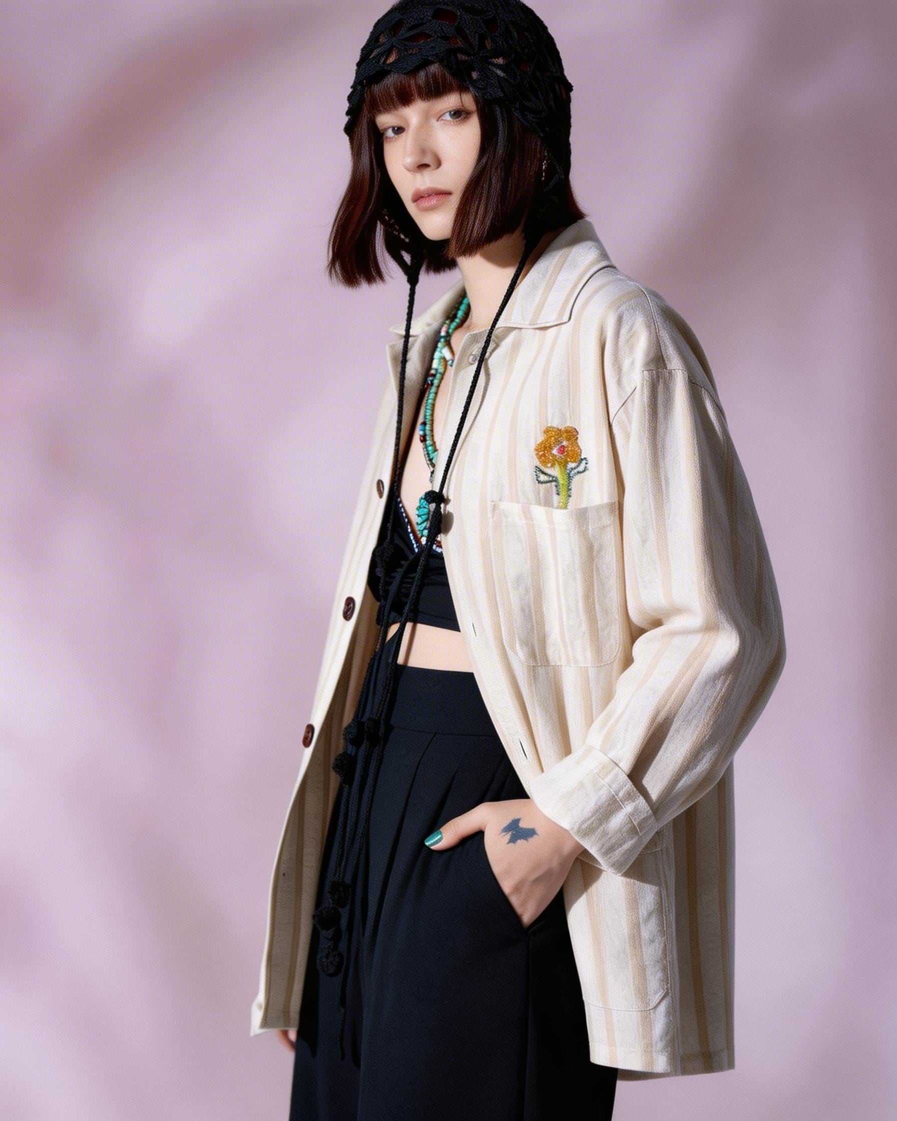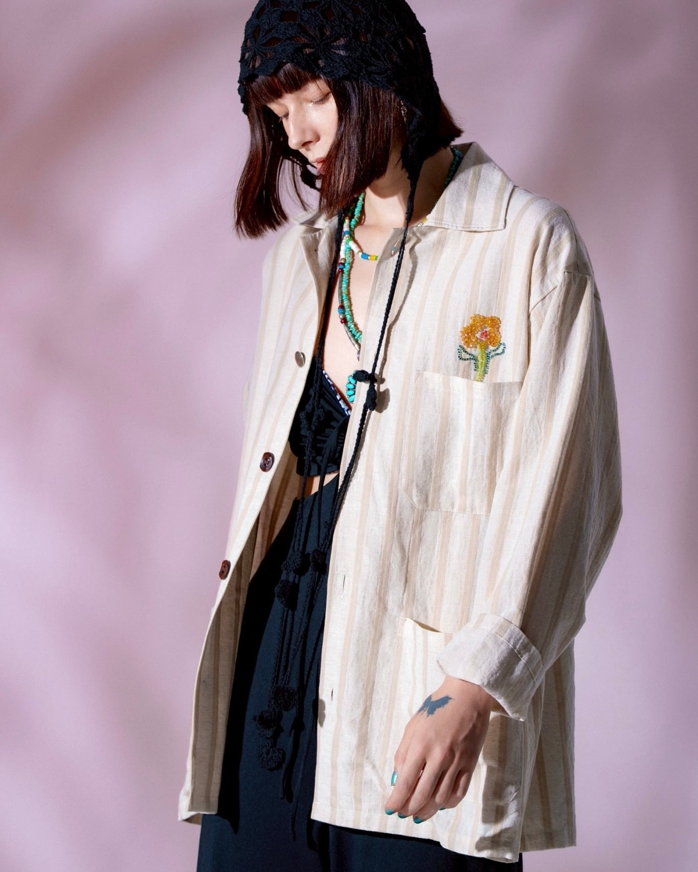・胸ポケットには、AMBERGLEAMのシンボルである花モチーフをビーズ刺繍で表現
