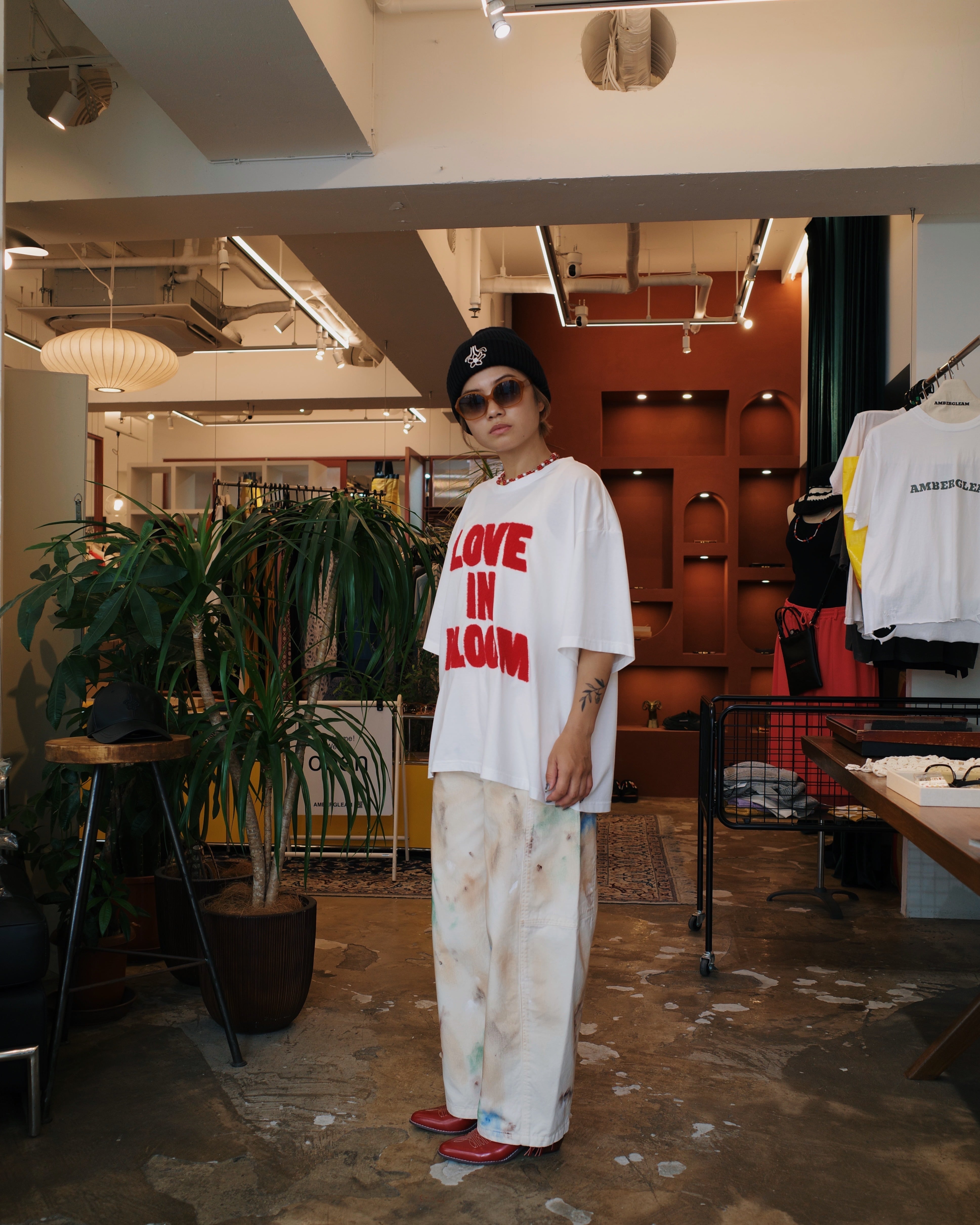 シンプルなTシャツにAMBERGLEAMらしい存在感を与えています。