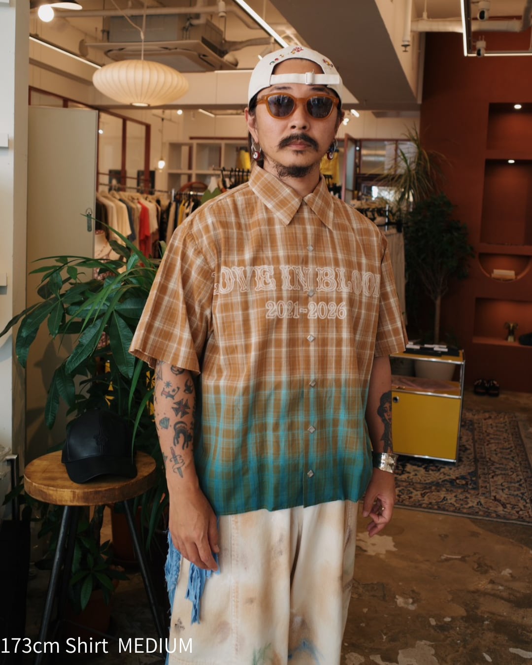 吊り染めによるグラデーション染めを、チェック生地の裾だけに施した一着。