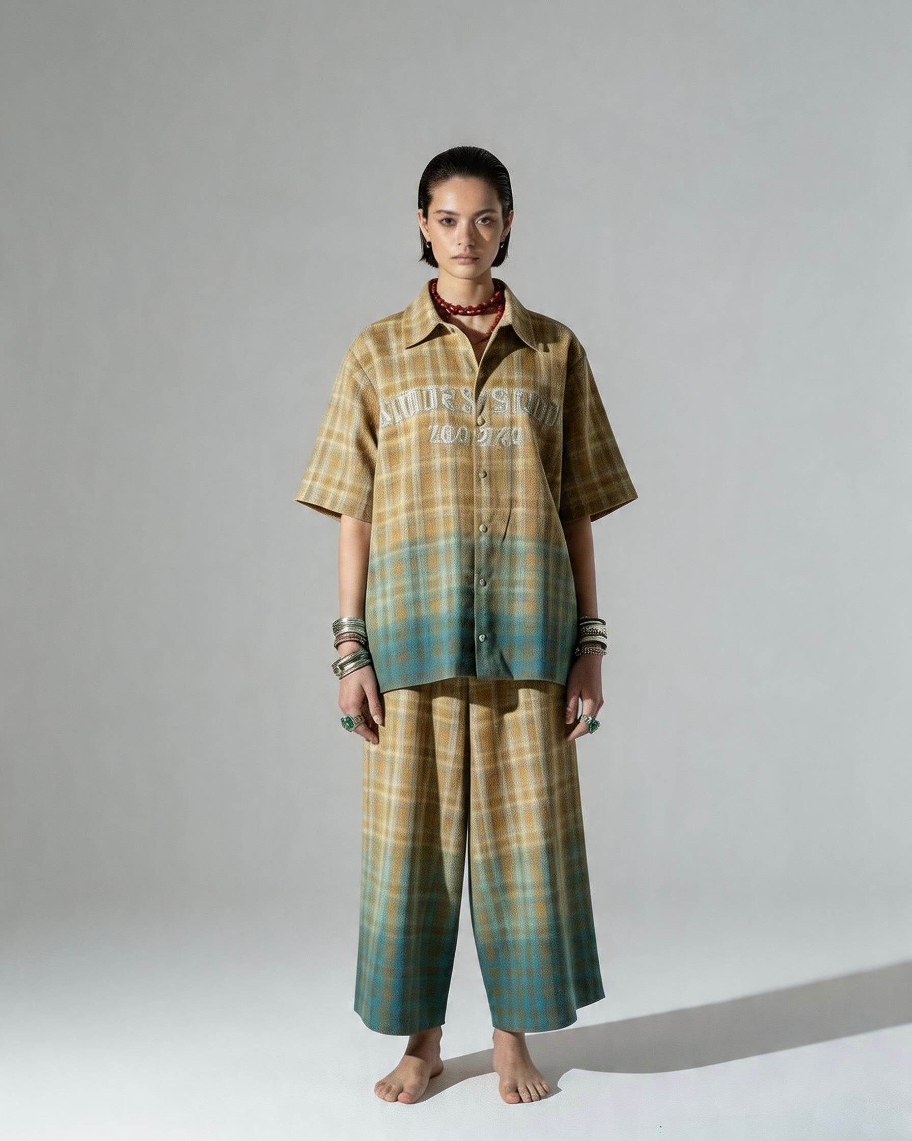 吊り染めによるグラデーションを、チェック生地の裾だけに施した一本。