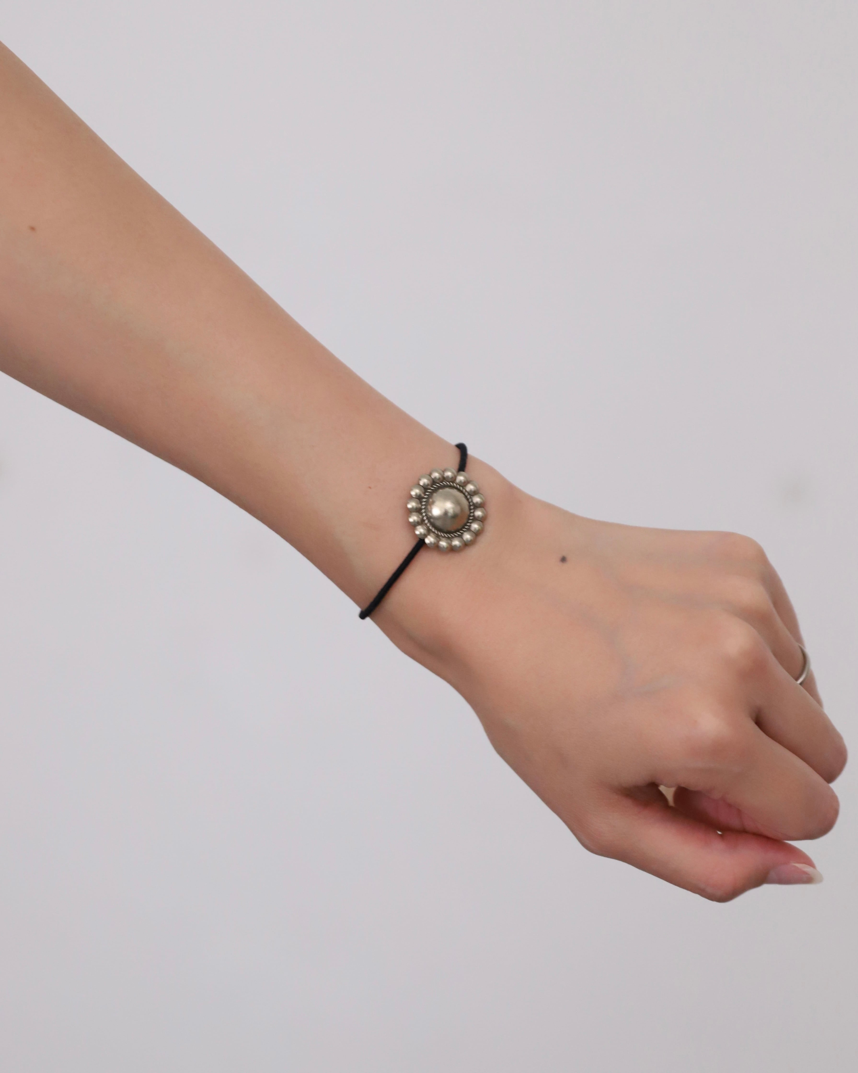 薄手のシルバープレートにスタンピングを施し凹凸のあるコンチョとなっています。