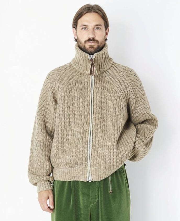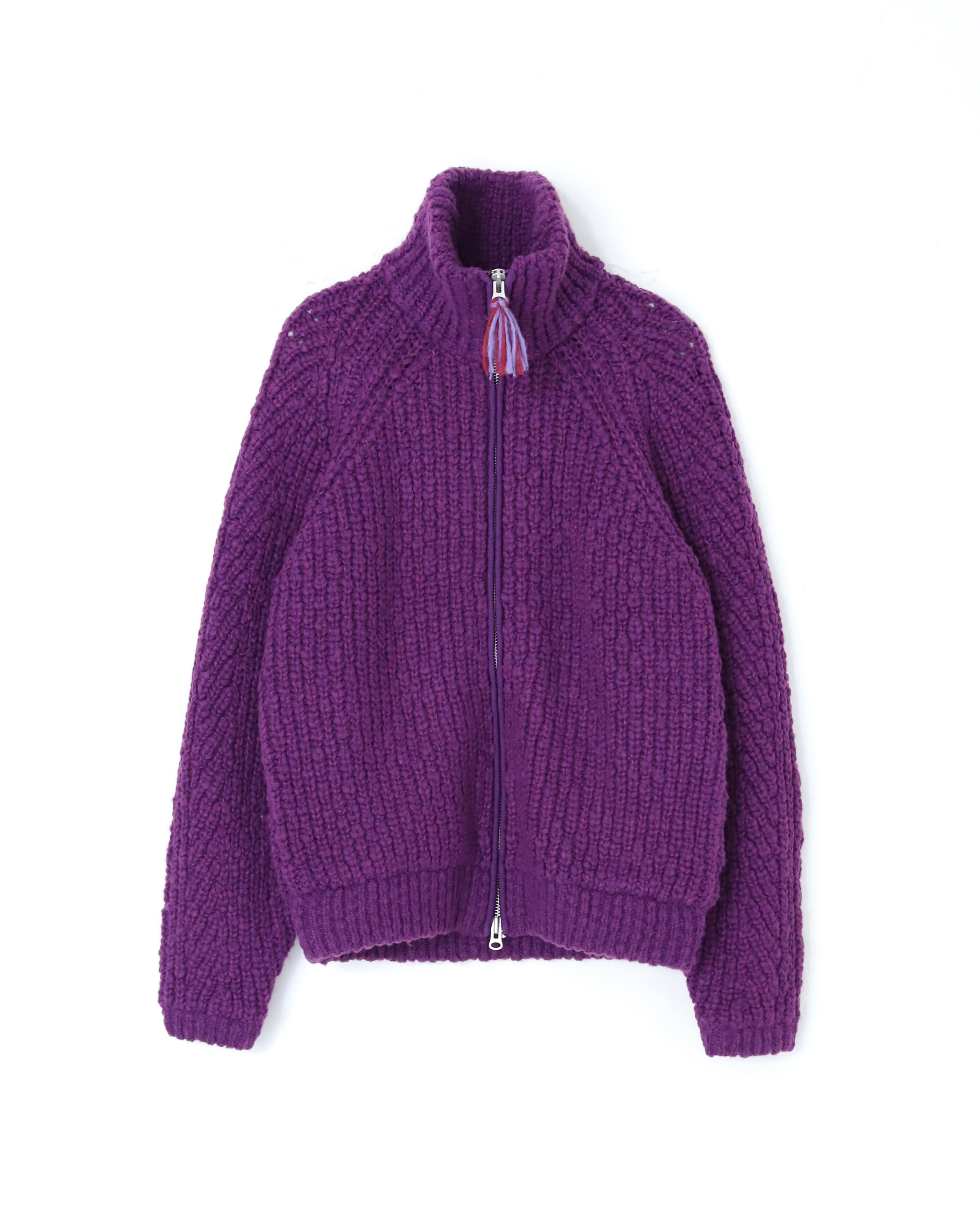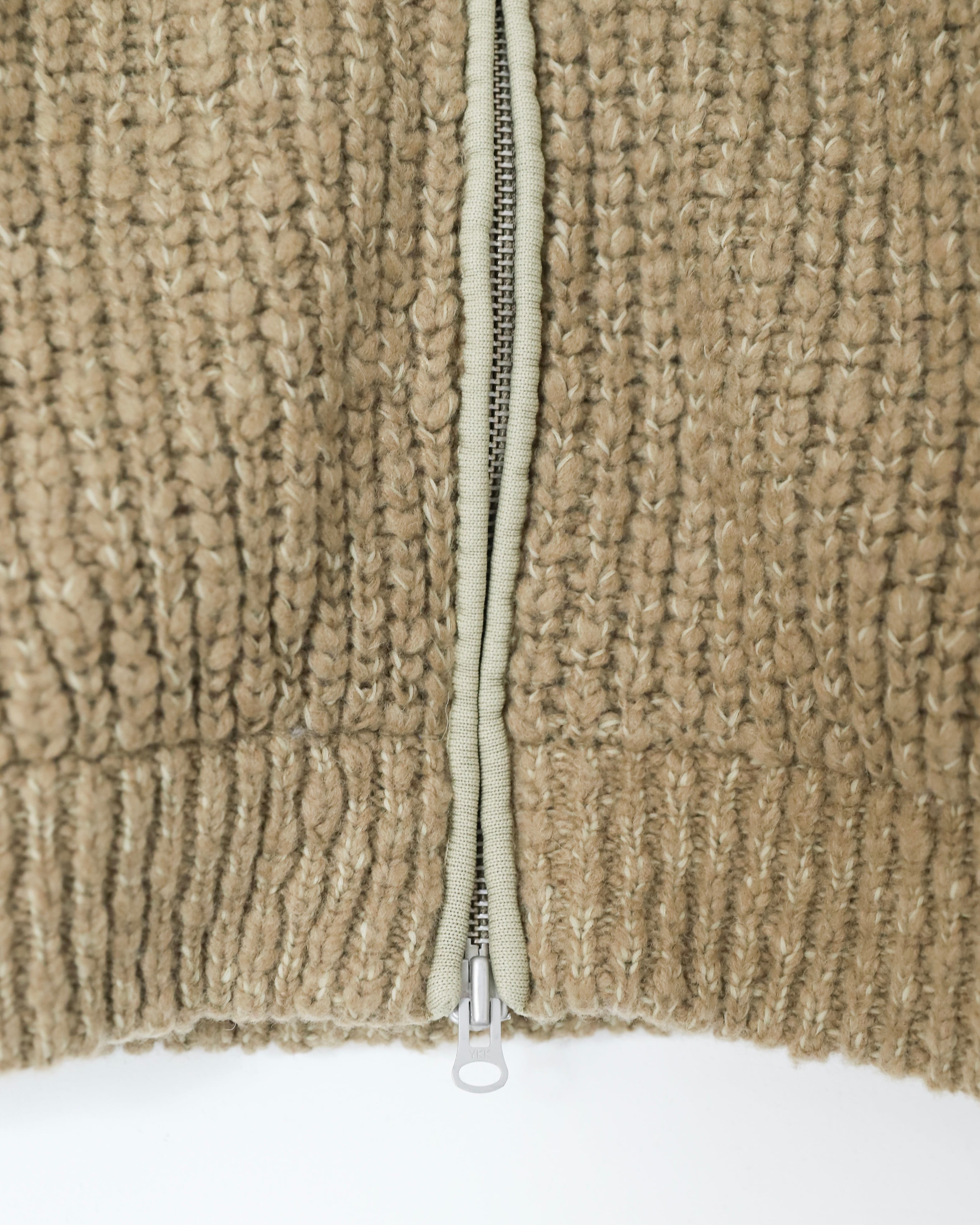 ~ぷっくりした表情豊かなブークレ糸で編み立てたスリム形ブルゾン~