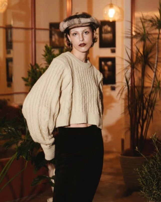 -表情のある糸を使用し、ふっくらとしたケーブル編みに仕上げた一品